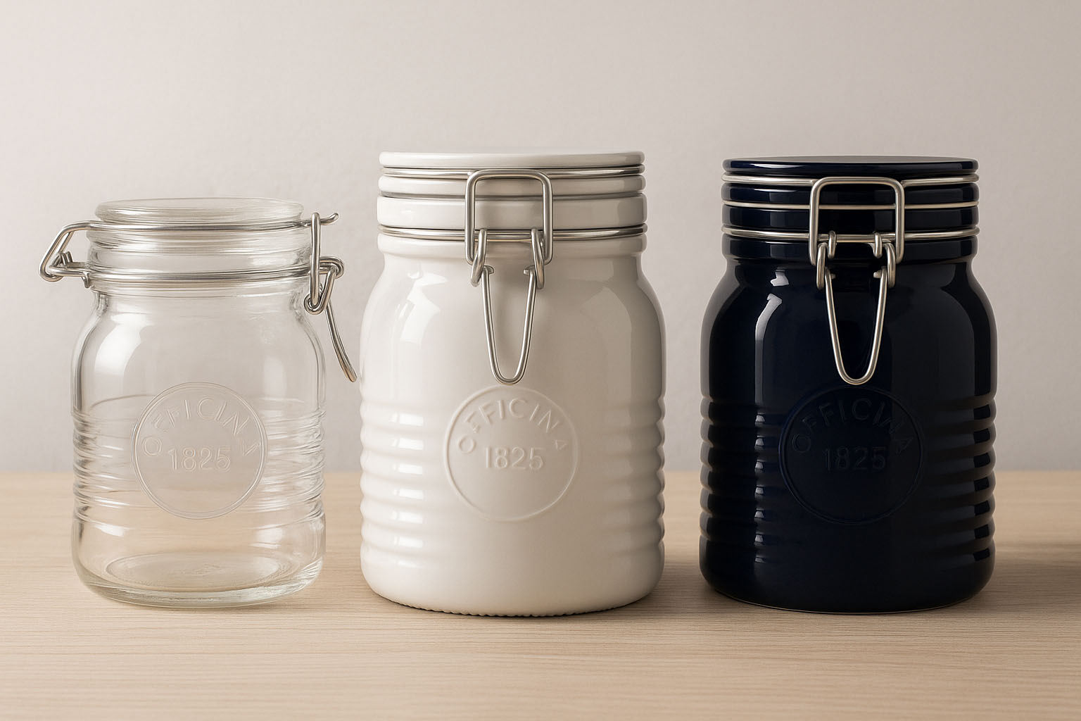 Serija „Officina 1825“ italijanskega proizvajalca Bormioli Rocco združuje vrhunsko izdelavo z nostalgičnim šarmom. Značilna zasnova z rebrastim steklom in vtisnjenim logotipom „1825“ naredi vsak kozarec pravo pašo za oči. Ti elegantni kozarci z žičnim zapiralom so posebej zasnovani za proizvajalce gurmanskih izdelkov, hotele in zahtevne zasebne polnitelje, ki cenijo estetiko in kakovost. Na voljo so v modri, rdeči in beli barvi kot del posebne serije Color, „Officina 1825“ pa ponuja ekskluzivno možnost za okusno in varno shranjevanje finih specialitet.