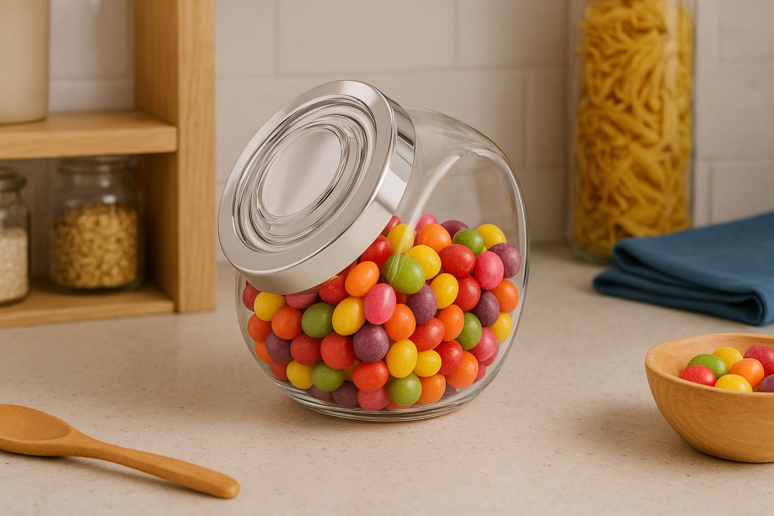 Serija „Pandora“ združuje eleganco in funkcionalnost v visokokakovostni stekleni posodi, ki je idealna za stilsko shranjevanje različnih živil. Ne glede na to, ali gre za bonbone, müsli, testenine ali druge dobrote – ta prestižna steklena posoda ponuja dekorativen in hkrati praktičen način shranjevanja. Njena vrhunska zasnova jo naredi ne le funkcionalen vsebnik, temveč tudi estetski element v vsaki kuhinji ali shrambi. S „Pandora“ lahko živila varno shranjujete in jih hkrati privlačno predstavite.