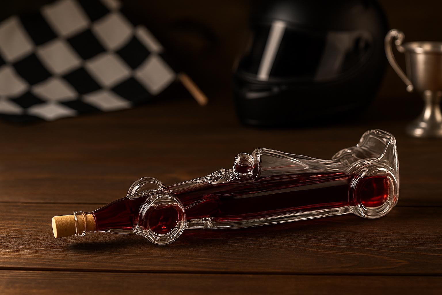 Steklenica z motivom „Dirkalnik“ je izjemna posebnost za navdušence nad motošportom in ljubitelje elegantnih steklenic. Njena podrobna oblika popolnoma ujame dinamiko in eleganco klasičnega dirkalnika ter jo naredi idealno izbiro za posebne žgane pijače, žganje ali likerje. Izdelana iz visokokakovostnega prozornega stekla združuje izrazit dizajn z vrhunsko obdelavo. Pluta na vratu steklenice zagotavlja stilsko zapiranje in ji daje prefinjen pridih. Naj bo kot darilo za ljubitelje motošporta ali kot ekskluzivna zbirateljska steklenica – steklenica „Dirkalnik“ vsakemu napitku doda hitrost in slog.